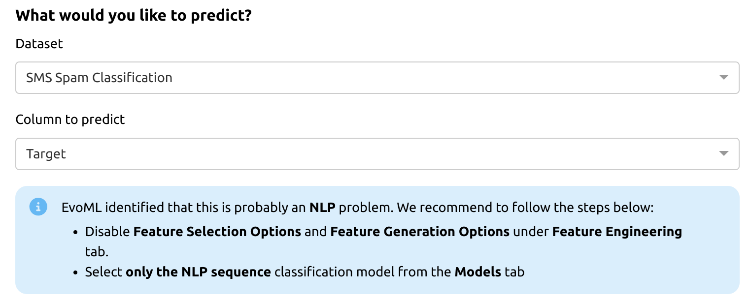 Notice the warning message in the screenshot below. If EvoML identifies an NLP problem, it is recommended to: